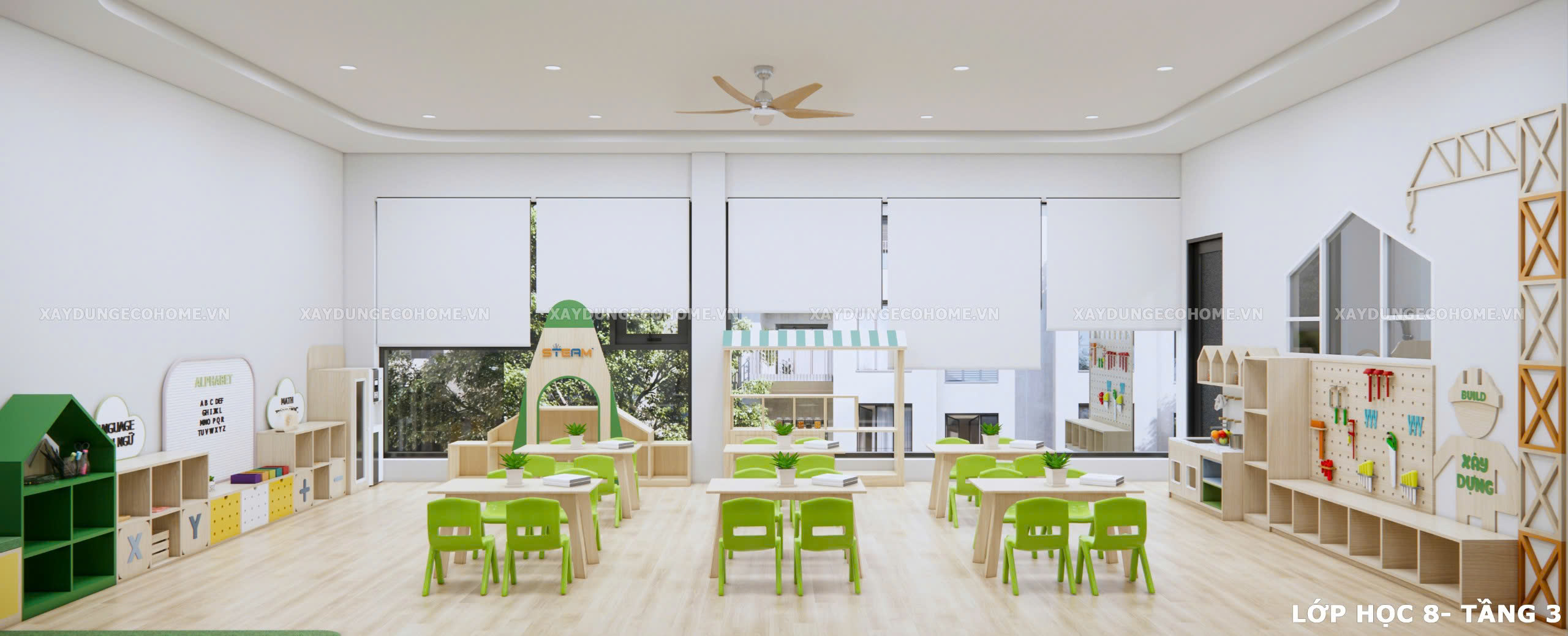 - Mỗi lớp học là một thế giới nhỏ xinh, được bố trí khoa học để trẻ dễ dàng di chuyển – tương tác – hoạt động nhóm.